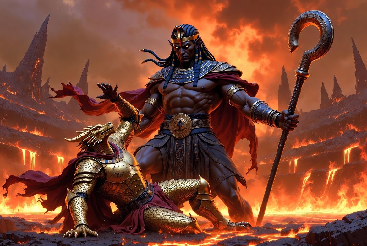 No, mlataranje ili ne, Oziris potpuno neuznemiren pojavom letećeg zmajorođenog koji mu vitla nečim ispre nosa, dozva skiptar sebi i baci ga opet na Thorstena.